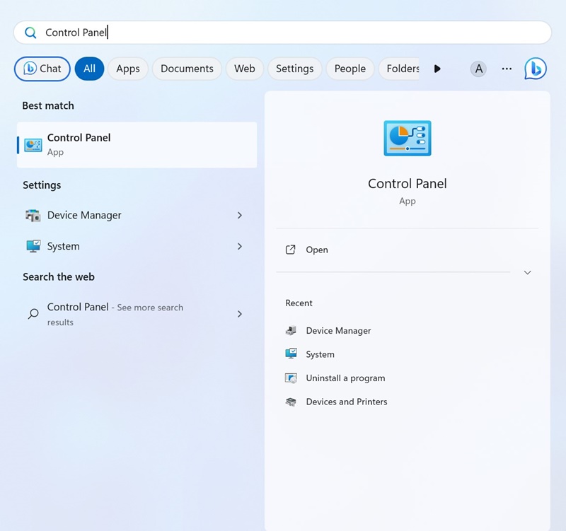 1。Windows 11検索にコントロールパネルを入力します。次に、開きますコントロールパネルベストマッチ結果のリストからのアプリ。
