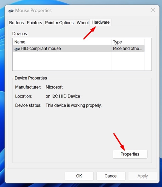 3。マウスの特性で、に切り替えますハードウェアタブとクリックしますプロパティ。