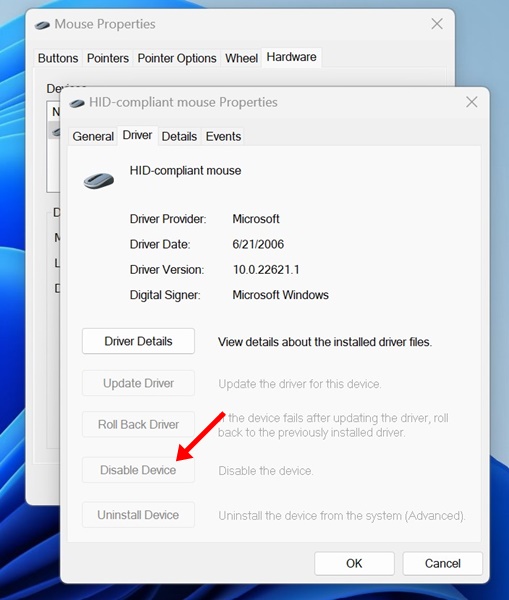 5.次に、ドライバータブに切り替えます。をクリックします無効にします デバイス。
