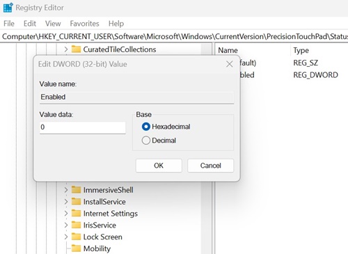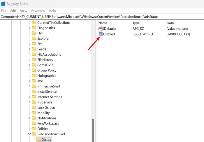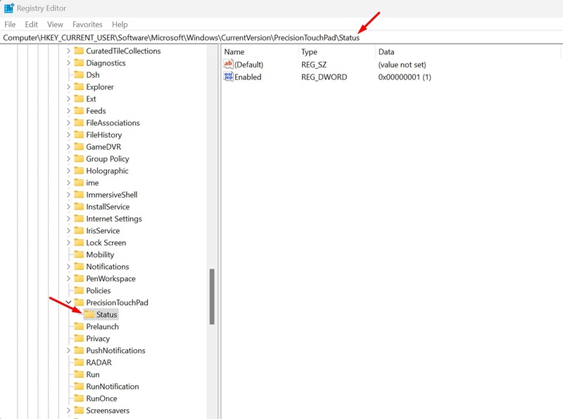 ComputerHKEY_CURRENT_USERSOFTWAREMicrosoftWindowsCurrentVersionPrecisionTouchPadStatus