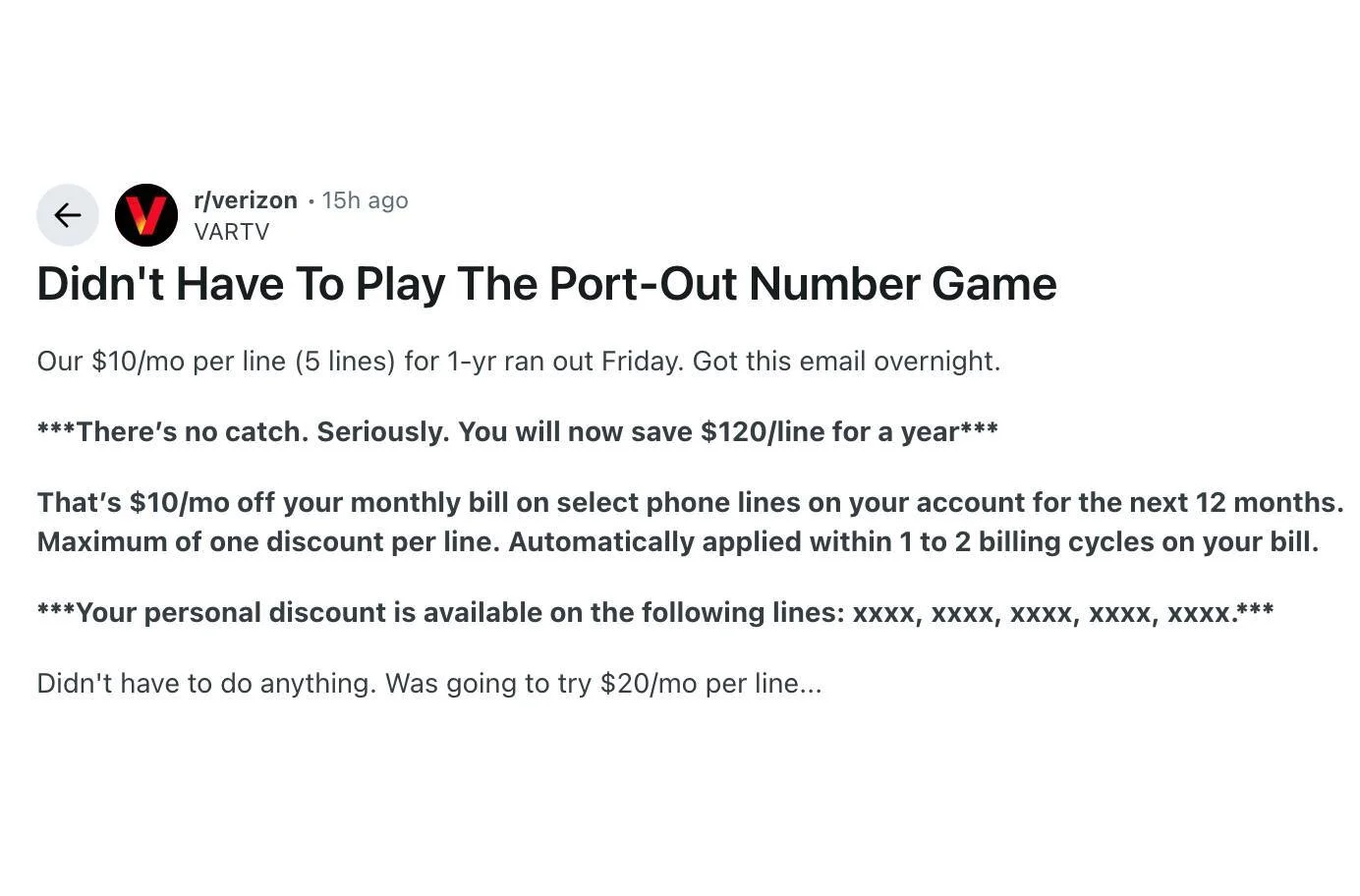 多くの顧客にとって、割引だけが会社を続ける唯一の理由だったため、これは最後の手段でした。その理由がなくなり、退職を決意する人も出てきました。ベライゾン何らかの形で割引を復活させるため。導入は混乱を招き、顧客の口に不快な思いをさせました。これがその理由を説明しています。ベライゾン現在はより良い方法が採用されています。