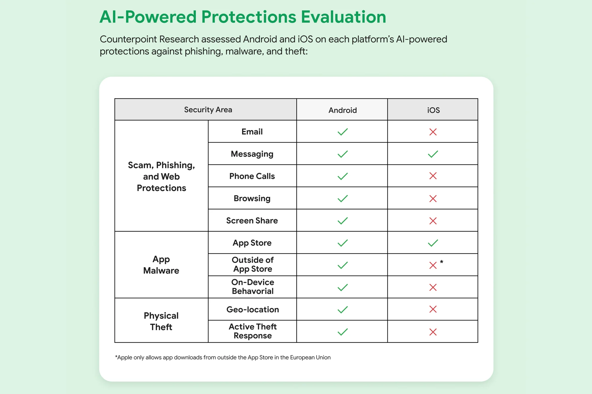Googleはセキュリティ企業のCounterpoint ResearchとLeviathan Security Groupからも評価に資金を提供した。 Counterpoint は、Android が 9 つの主要な領域にわたって包括的な AI 主導の保護機能を提供しているのに対し、iOS には 2 つの領域のみが提供されていることがわかりました。 Leviathan は、Pixel を筆頭とする Android スマートフォンがデフォルトで最高レベルの詐欺防止を提供していると結論付けました。この「デフォルト」の部分が重要です。 iPhone ではサードパーティのブロッカーを入手できますが、Google はこの機能を箱から出してすぐに実行できると主張しています。