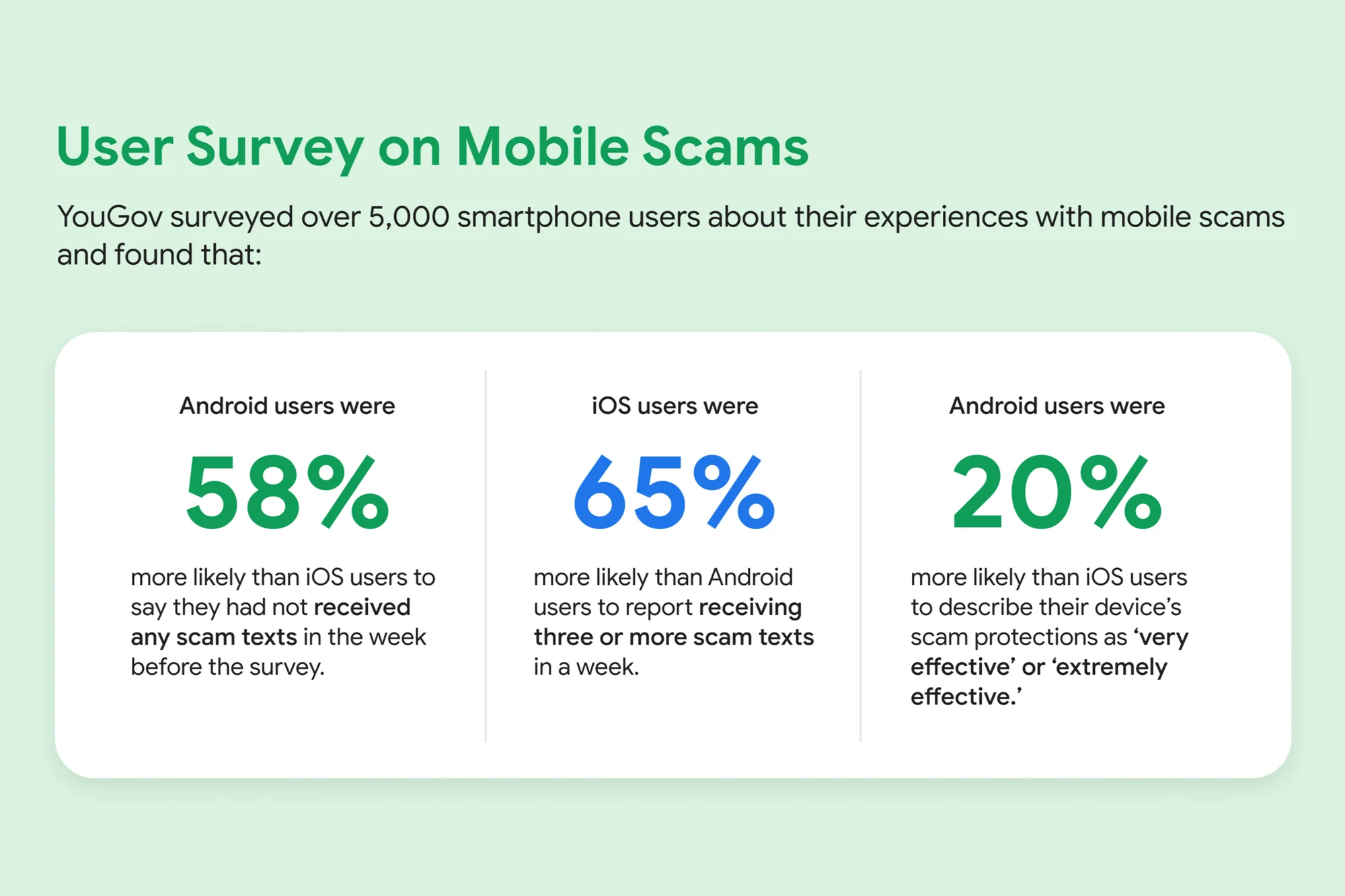 - 反対に、iOS ユーザーは 1 週間に 3 件以上の詐欺テキストを受け取ったと報告する可能性が 65% 高くなりました。