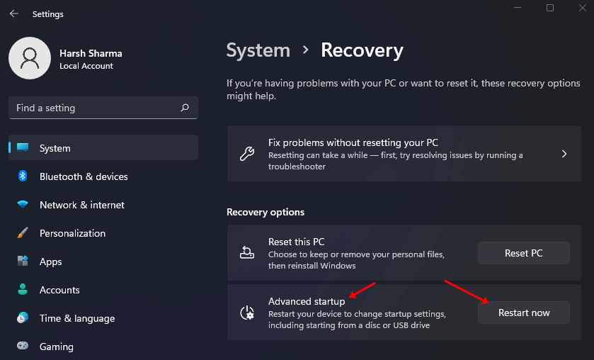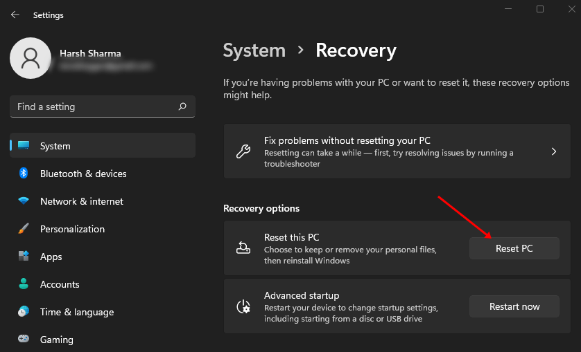 まだ問題に直面している場合は、PCをリセットしてください。これは、他のトラブルシューティングステップが問題を解決するのに役立ちなかった場合に継続する最後の手段です。 PCをリセットするには、下記の手順に従ってください -