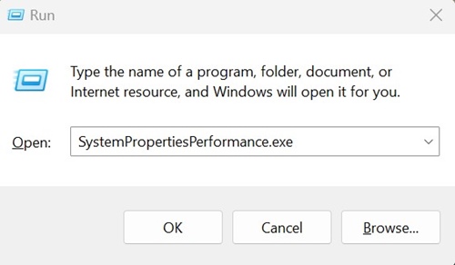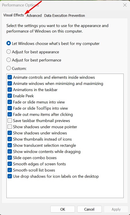 3. これにより、パフォーマンスオプションウィンドウ。に切り替えますビジュアル 効果。