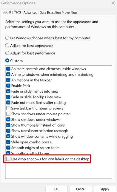 デスクトップ アイコンのテキストをさらにカスタマイズしたい場合は、ドロップ シャドウを有効または無効にすることができます。
