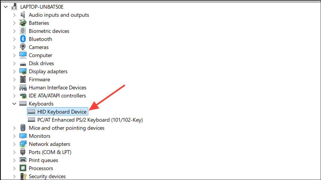 ステップ2:拡張しますKeyboardsセクション。 組み込みのキーボードを右クリックします(多くの場合、としてリストされていますHID Keyboard Device)そして選択しますDisable device。無効オプションが利用できない場合は、ドライバーを回避策として互換性のないドライバーに更新できますが、後でドライバーを復元するのが快適でない限り、これは推奨されません。