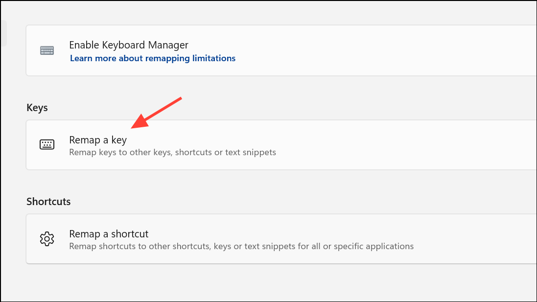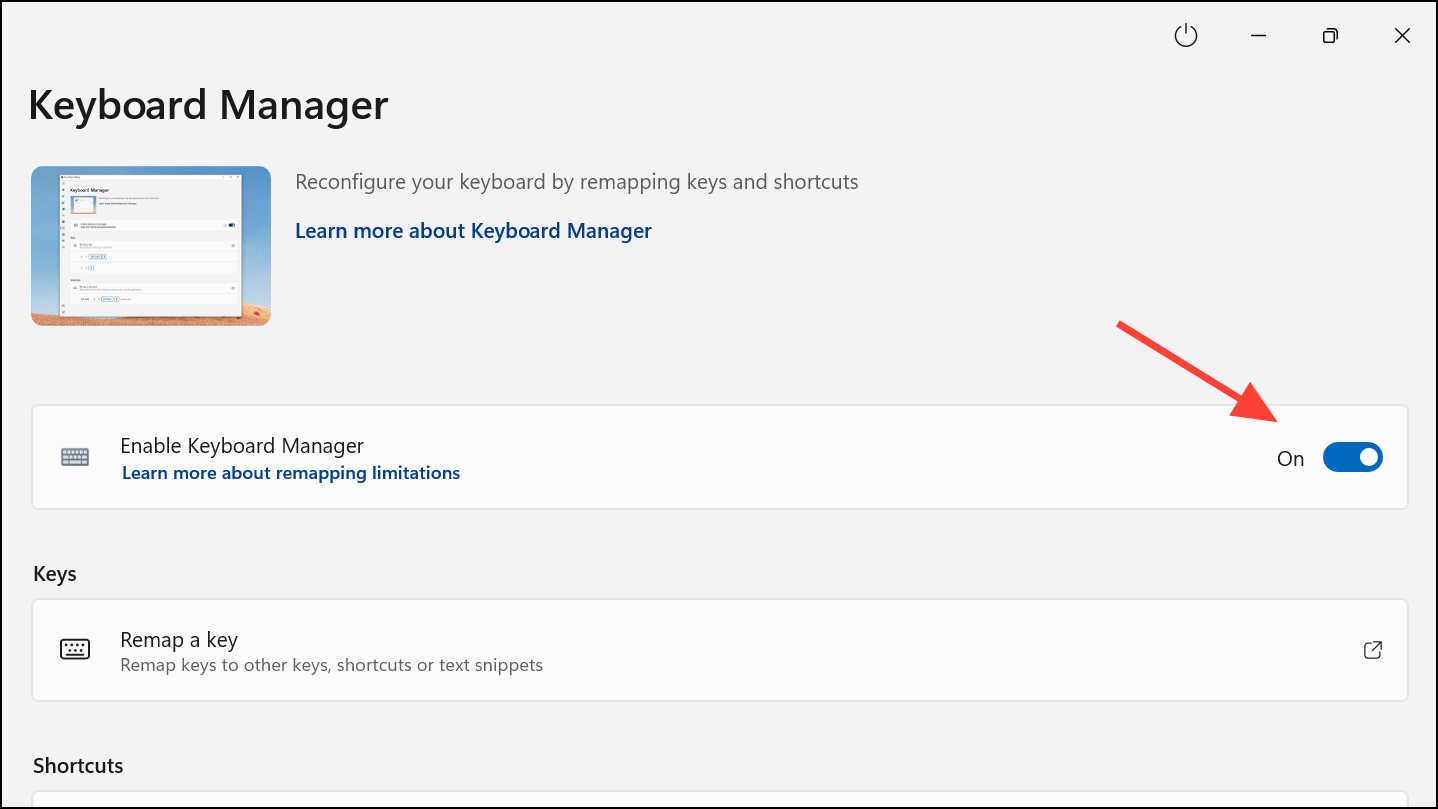ステップ3:キーボードマネージャーが現在オフの場合はトグルを有効にします。これにより、キーボードのキーやショートカットを再マッピングまたは無効にすることができます。