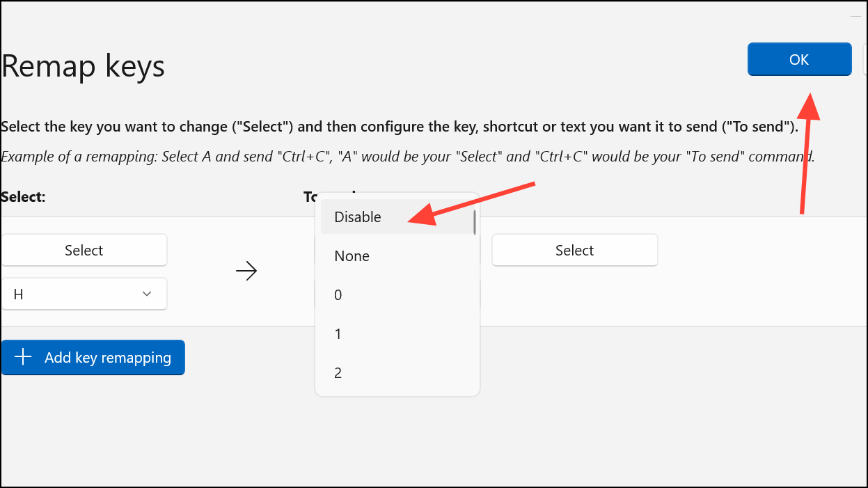 ステップ6:から無効にするキーを選択しますSelectドロップダウンしてから設定しますTo SendにDisable。クリックOK変更を適用します。警告が表示されている場合は、選択して確認してくださいContinue Anyway。