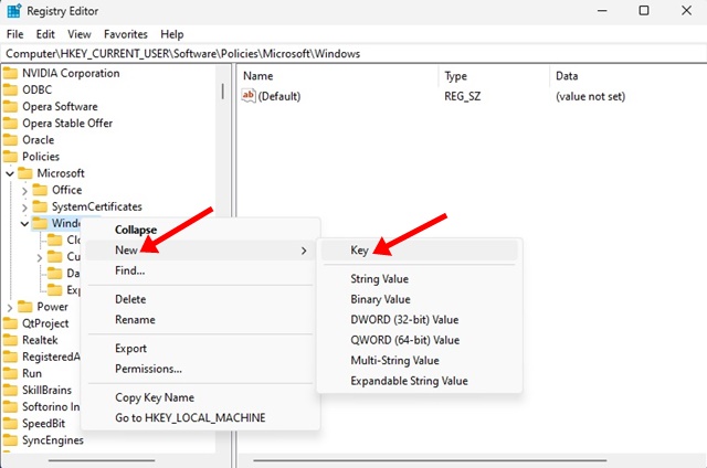 4. 左側の Windows キーを右クリックし、新規 > キー.