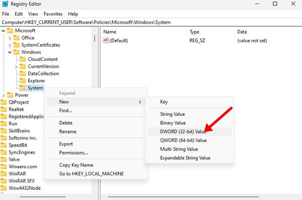 6. システム キーを右クリックし、新規 > DWORD (32 ビット) 値.
