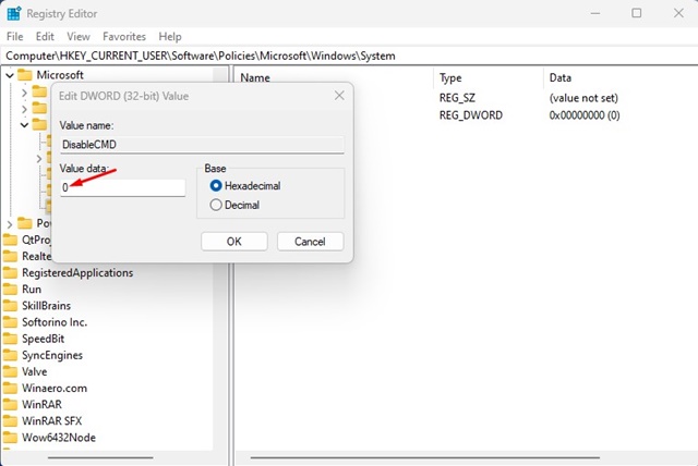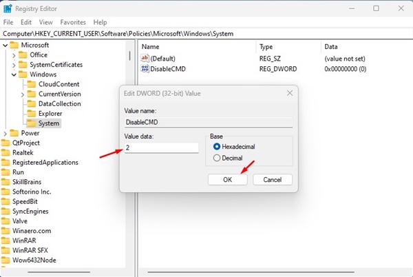 7. 新しい DWORD 値に次の名前を付けます。CMDを無効にする。 [値のデータ] フィールドに次のように入力します。2そして、わかりましたボタン。