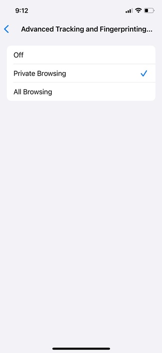 5.これで、オフ、プライベートブラウジング、およびすべてのブラウジングの3つのオプションが見つかります。