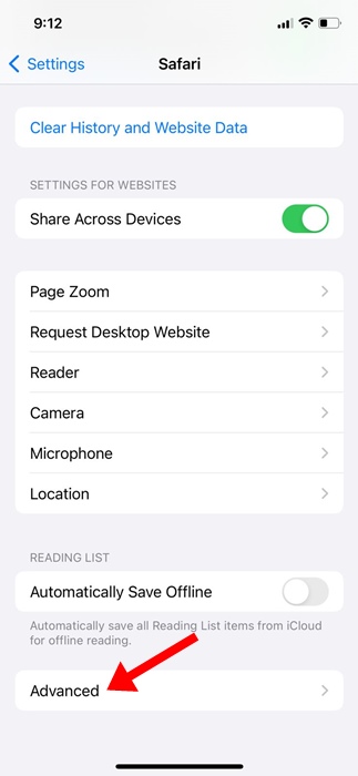 3.下にスクロールしてタップします高度な。