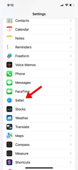 2。設定アプリが開いたら、下にスクロールしてタップしますサファリ。