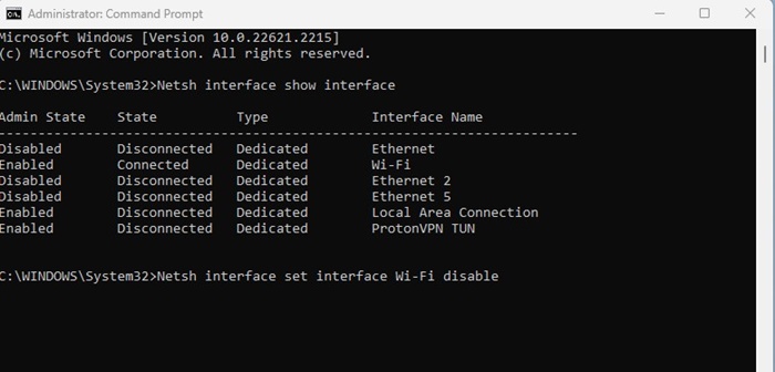 3.上記のコマンドには、すべてのネットワークアダプターが一覧表示されます。無効にするネットワークアダプターであるインターフェイス名に注意してください。