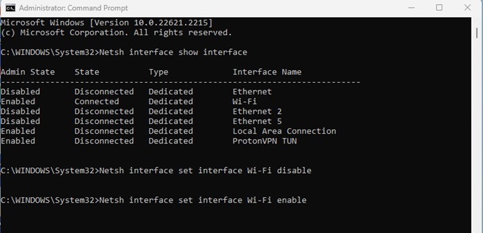 6.ネットワークアダプターを有効にするには、インターフェイス名をあなたが望むアダプター名に置き換えて、指定されたコマンドを実行します有効にする。 (引用符なし)