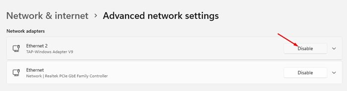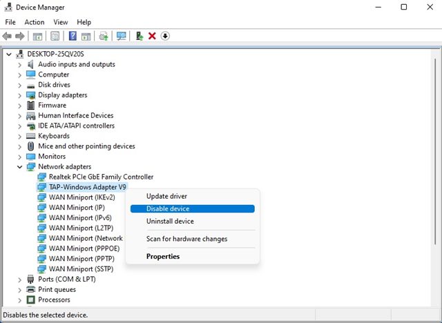 4。ネットワークアダプターの下で、アダプターを選択します無効にしてクリックします無効にしますボタン。