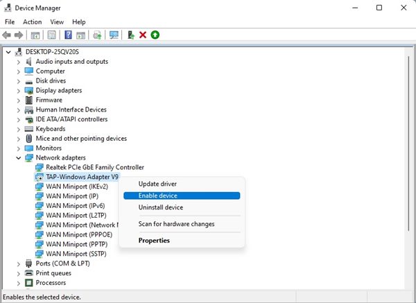 4。ネットワークアダプターを有効にするには、ネットワークデバイスを右クリックして選択しますデバイスを有効にします。