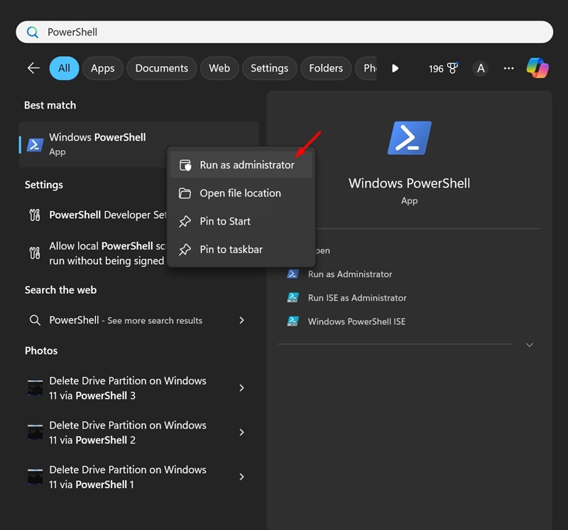 1。Windows 11検索でPowerShellを入力します。次に、PowerShellを右クリックして、[管理者として[実行]を選択します。
