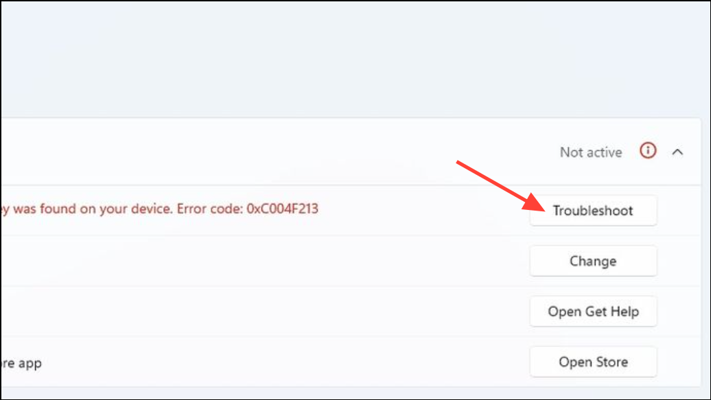 ステップ2:アクティベーションエラーが表示されている場合は、クリックしますトラブルシューティング。このオプションは、Windowsがアクティベーションの問題を検出した場合にのみ表示されます。