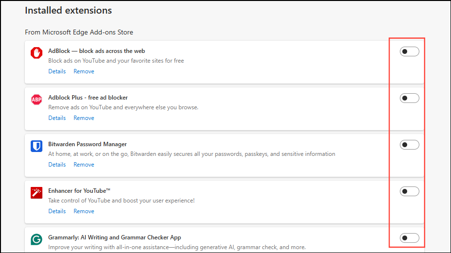 - すべての拡張機能を切り替えて無効にします。