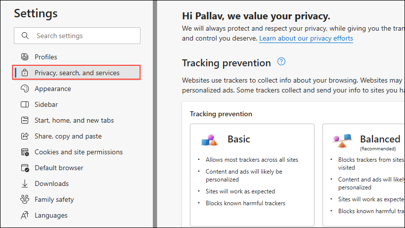 Edgeの追跡予防機能は、特定のWebコンポーネントをブロックし、副操縦士に影響を与える可能性があります。この設定を調整すると役立つ場合があります。