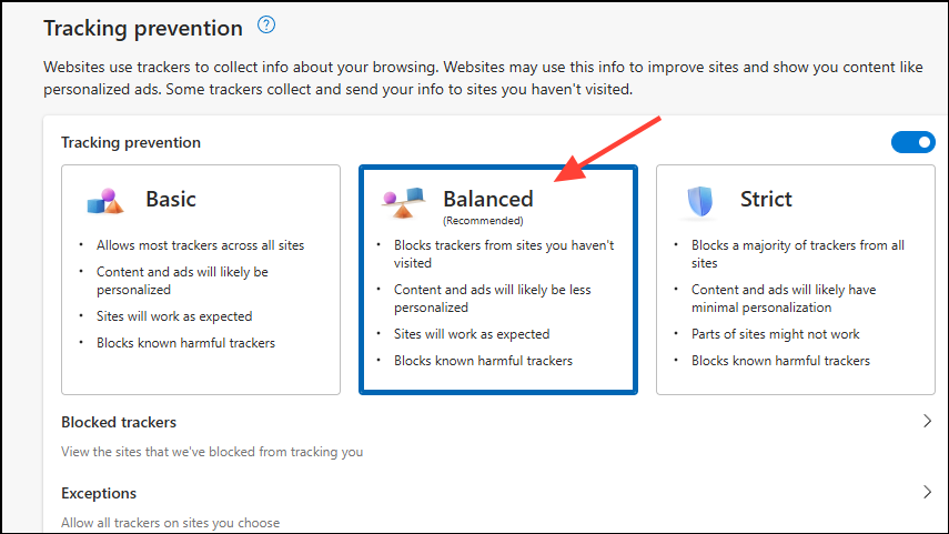 - 追跡防止の下で、バランス(デフォルト設定)を選択します。
