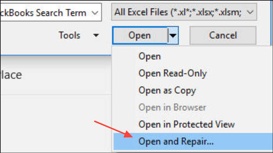 ステップ2:次の矢印をクリックしますOpenボタン、選択しますOpen and Repair。この組み込みのツールは、腐敗を修正し、失われたフォーマットを回復しようとします。