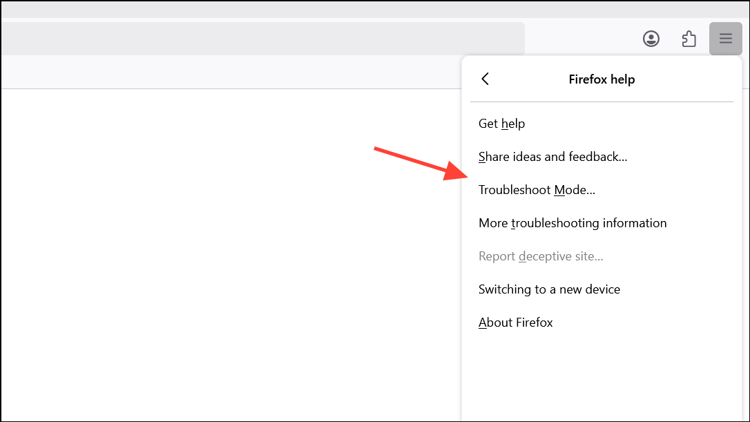 ステップ2:問題のあるアドオンを特定するには、選択してトラブルシューティングモードでFirefoxを開始しますHelp > Troubleshoot Mode。これにより、すべての拡張機能とテーマが一時的に無効になります。メモリの使用状況を観察します。それが大幅に低下する場合、1つ以上のアドオンが原因である可能性があります。