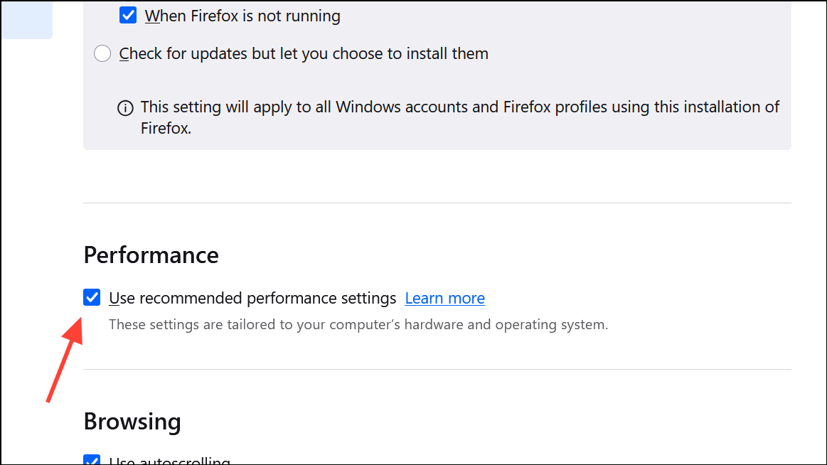 ステップ1:行きますSettings > General > Performance。のボックスを確保しますUse recommended performance settingsチェックされているか、手動で有効になりますUse hardware acceleration when available。