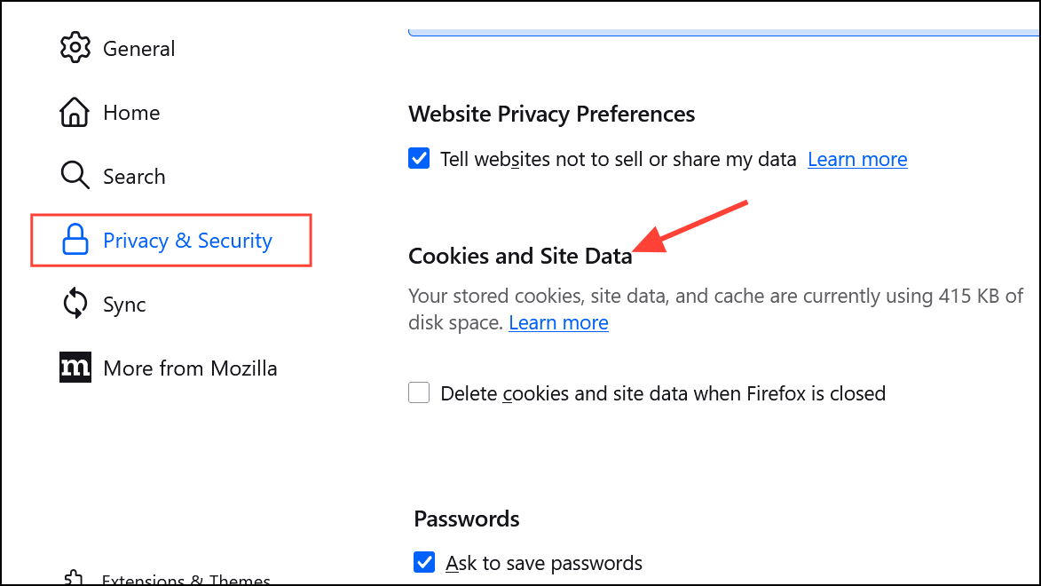 ステップ1:開けるSettings > Privacy & SecurityにスクロールしますCookies and Site Dataセクション。