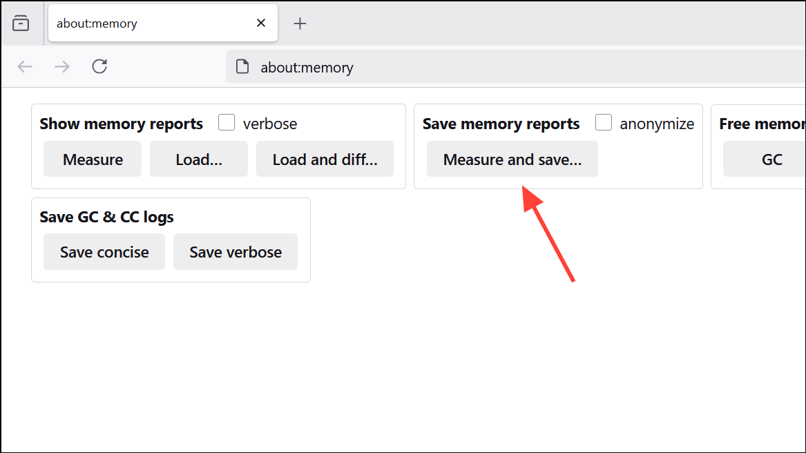 ステップ2:クリックMeasure and save...メモリ使用レポートを生成します。バグが疑われる場合は、このレポートを開発者レビューのFirefoxバグレポートに添付してください。