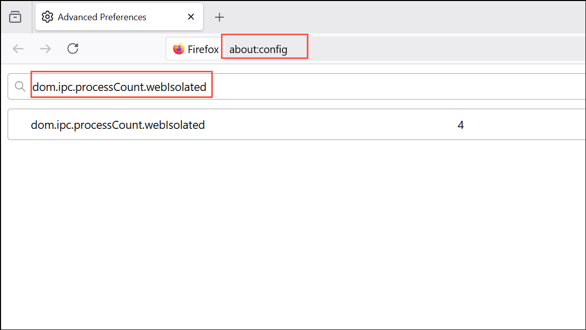 ステップ1:入力about:configアドレスバーで検索しますdom.ipc.processCount.webIsolated。