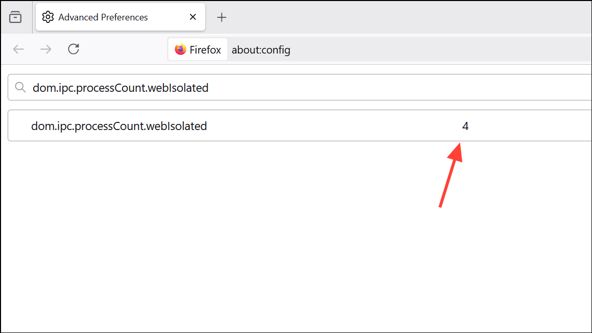 ステップ2:値を下げます(例:8から4)。これにより、タブのFirefoxスポーンの個別のプロセスの数が減り、サイトの分離の潜在的なコストで全体的なメモリ使用量が減少します。