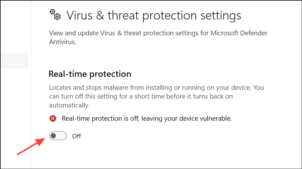 ステップ2:リアルタイム保護のために設定にアクセスします。 Windowsのディフェンダーでは、クリックしますManage settings下Virus & Threat Protection Settings切り替えますReal-time protection。サードパーティのアンチウイルスソフトウェアの場合、アイコンを右クリックして、次のようなオプションを選択しますDisableまたはPause Protection。