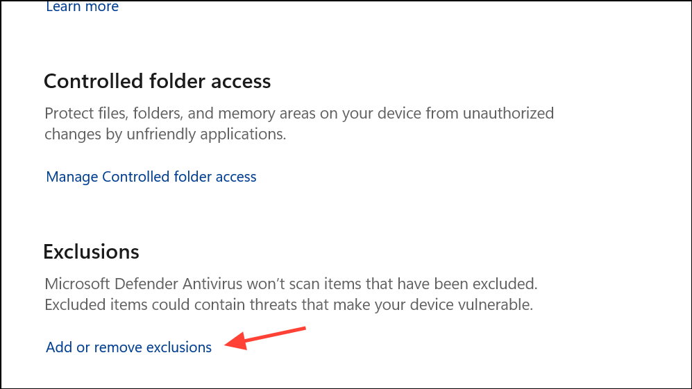ステップ3:ファイルをもう一度ダウンロードしてみてください。ダウンロードが完了し、ファイルを開くことができる場合、ウイルス対策が原因である可能性があります。将来の保護の無効化を避けるために、ダウンロードフォルダーをウイルス対策ホワイトリストまたは除外リストに追加します。 Windows Defenderでは、これは下にありますVirus & Threat Protection > Manage settings > Exclusions。他のウイルス対策ソフトウェアについては、除外を管理するためのドキュメントを参照してください。