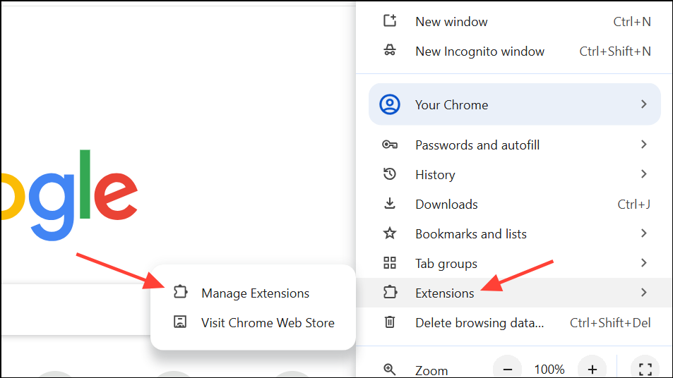 ステップ1:Chromeのメニューを開いて移動しますExtensions > Manage extensions。