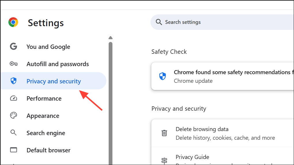 ステップ1:Chromeの3ドットメニューをクリックして、選択しますSettings、次に行きますPrivacy and security。