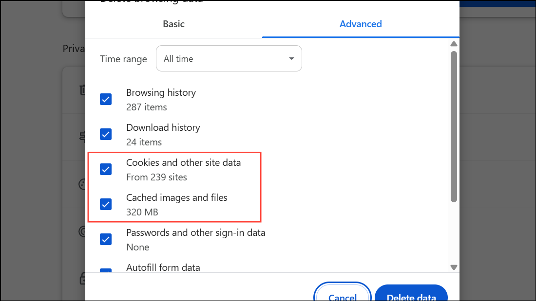ステップ2:クリックDelete browsing data。選択しますCookies and other site dataそしてCached images and files、クリックしますClear data。