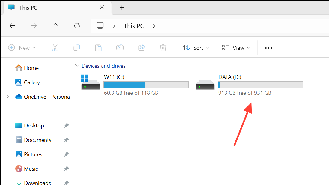 ステップ2:ストレージドライブには、ダウンロードしているファイルに十分な空きスペースがあることを確認してください。 Windowsで、開きますThis PCダウンロードドライブで利用可能なスペースを確認します。スペースが低い場合は、不要なファイルを削除するか、ダウンロードを別のドライブに移動します。