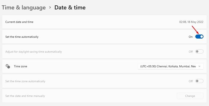 4。日付と時刻のページで、オンにするトグルに時間を自動的に設定します。