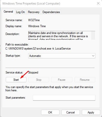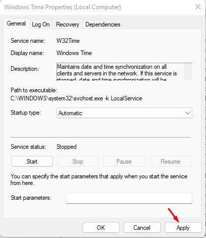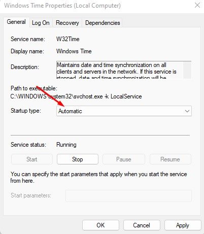 3. Windows時間をダブルクリックします。スタートアップタイプの背後にあるドロップダウンメニューをクリックして、選択します自動。