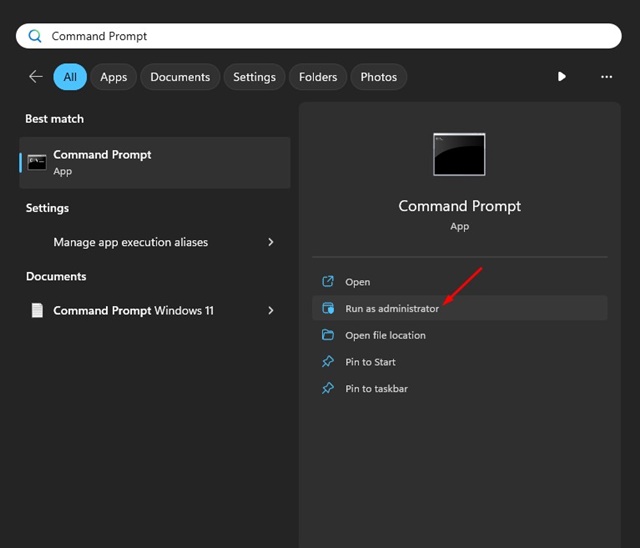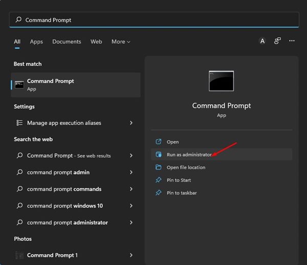 1. Windows 11の検索を開き、入力しますコマンドプロンプト。コマンドプロンプトを右クリックして選択します管理者として実行します。
