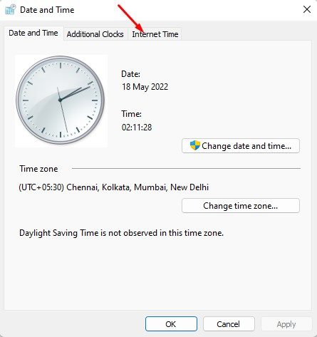 3。日付と時刻のウィンドウで、クリックしますインターネットの時間。