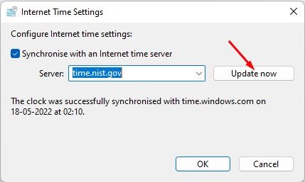 5.「インターネットタイムサーバーと同期する」オプションを確認し、別のインターネットタイムサーバーを選択します。これを行ったら、クリックします今すぐ更新してください。